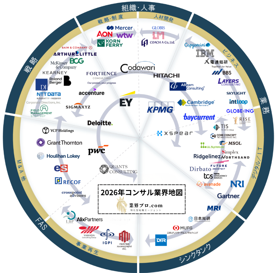 本記事では、「2026年コンサル業界地図」 をもとに、各領域の位置づけや、企業分類の意味、マップの読み解き方を